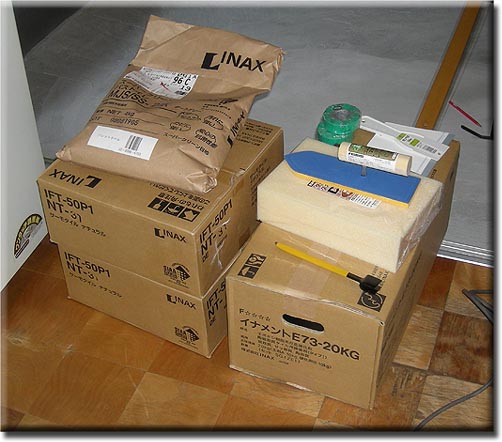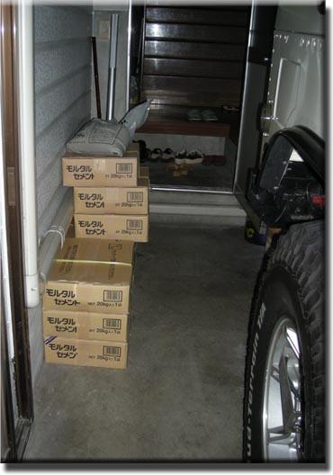 モルタルの立米数を計算して、ちょっと割高ですが水を入れて混ぜるだけの接着剤混入砂入セメントをDIYセンターから210Kg買って来ました。(^_^;)もちろんスポンサーは親父です・・・思い出したようで・・・