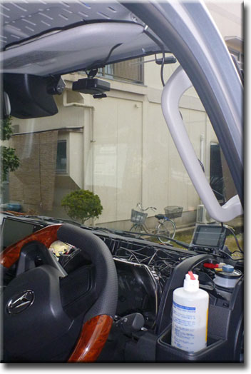 レーザー受光部はフロントガラス上部に付けます配線は見えない様にします、テストのため取りあえずバイザーに挟でいます。