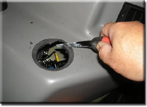 画像は埋め込むのに円カッターで表面のレザーを切っています。