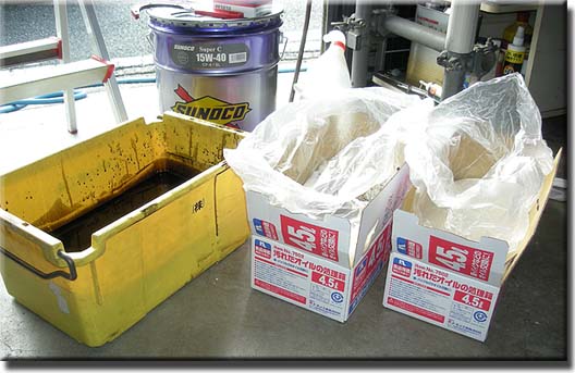 新しいOILをジョッキーで8L入れて完了、20リットル缶も2回の交換で終わりです、次回の為に注文して置きましょう。