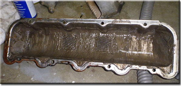 カバーを取り外す際ヌルッとしたので裏側を見ると乳化したオイルが見れます。(^_^;)排気側だけでなくエンジン側にも冷却水が漏れていたわけですね・・・
